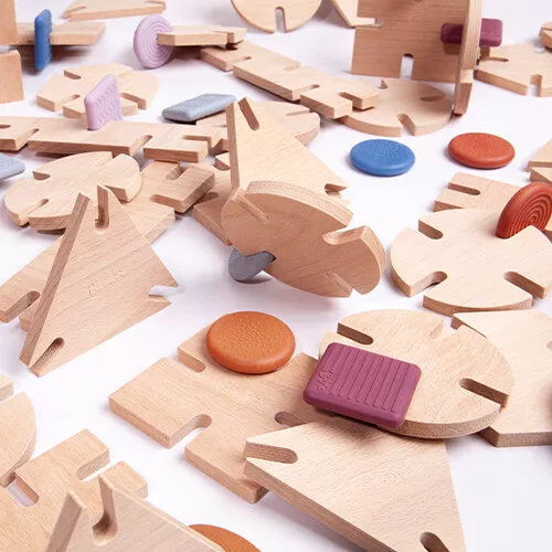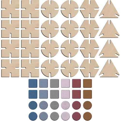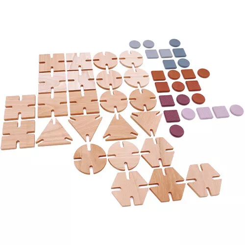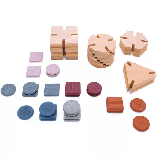 De duurzame kinderspeelgoedset bestaat uit 48 bouwstenen; 24 geometrische, houten basiselementen en 24 sensorische, siliconen verbindingselementen. De houten en siliconen elementen zijn dankzij de inkepingen eenvoudig met elkaar te verbinden.