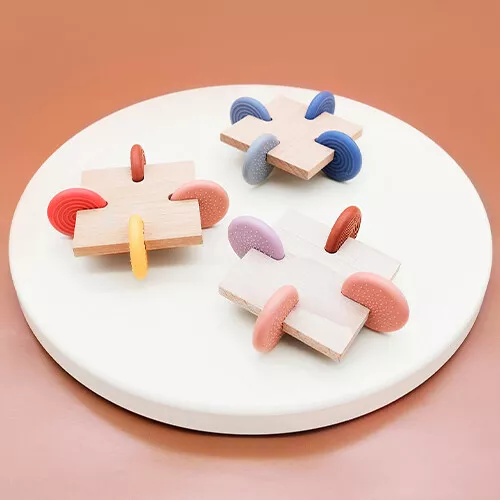 De connectors zijn makkelijk te verbinden met de houten elementen van het kinderspeelgoed van de Bavvic, die inkepingen hebben. Â