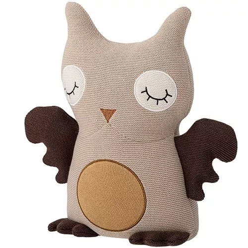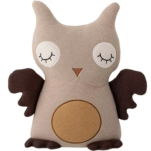 De slaperige uilenknuffel heeft donkere vleugels en poten, geborduurde ogen, een zacht snaveltje en rond vlak op zijn buik.