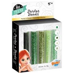 Om creatief aan de slag te gaan een set van kleine kraaltjes in ‘Tubes de perles vertes’ van het Franse merk Buki voor het maken van armbandjes of kettingen. Deze set bestaat uit kralen in verschillende groentinten. Mix de kleuren voor een mooi resultaat.
