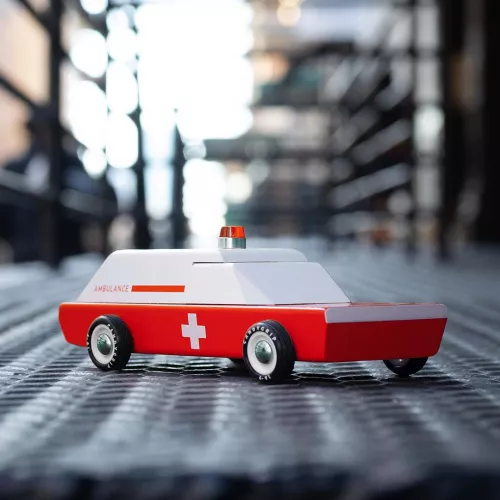 Bij een noodoproep is deze speelgoedwagen ‘Ambulance Wagon’ uit de collectie Candycar van het Amerikaanse merk Candylab snel ter plaatse.