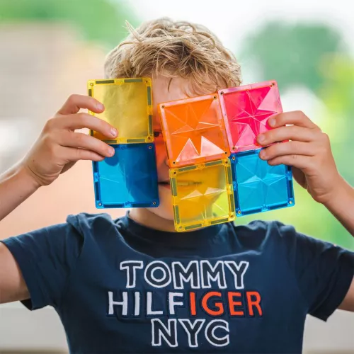 Met 20 speeltegels in regenboogkleuren ‘Coblo Classic – 20 Stuks’ van het Nederlandse merk Coblo bouwen kinderen fantastische bouwwerken. De speeltegels met magnetische randen kunnen aan elkaar geklikt worden om platte en compacte kunstwerken te maken.