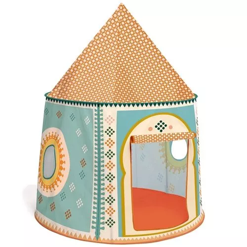 Een vrolijk gekleurde, stoffen speeltent ‘Cabane Orientale’ van het Franse merk Djeco. De kindertent is makkelijk in elkaar te zetten en geschikt voor binnenspelen.