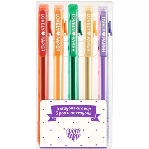 Vijf uitschuifbare waxpennen ‘5 Crayons Cire Pop’ uit de ‘Lovely Paper’ serie van het Franse merk Djeco om te illustreren en mooie tekeningen mee te maken.