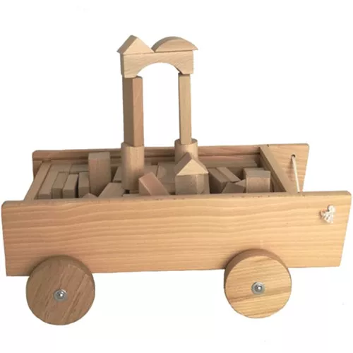 Met deze houten blokkenwagen van het Belgische merk Egmont Toys kunnen de speelgoedblokken gemakkelijk door het huis vervoerd worden. Trek aan het koord en de speelgoedwagen rijdt mee.