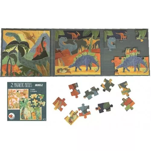 Twee magnetische puzzels ‘Dino’ van het Belgische merk Egmont Toys in een prehistorisch landschap, in een drieluik album.