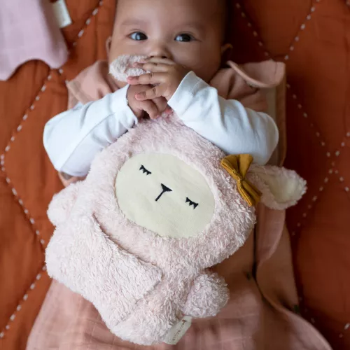 Het lichtroze konijn heeft een voorvakje voor kleine spulletjes en is een betrouwbaar vriendje in de kinderwagen, bed of tijdens het spelen.