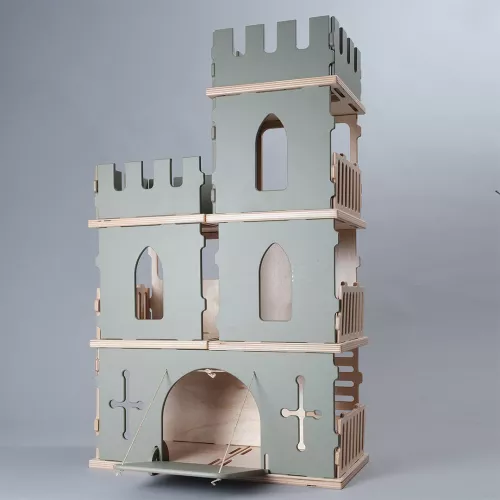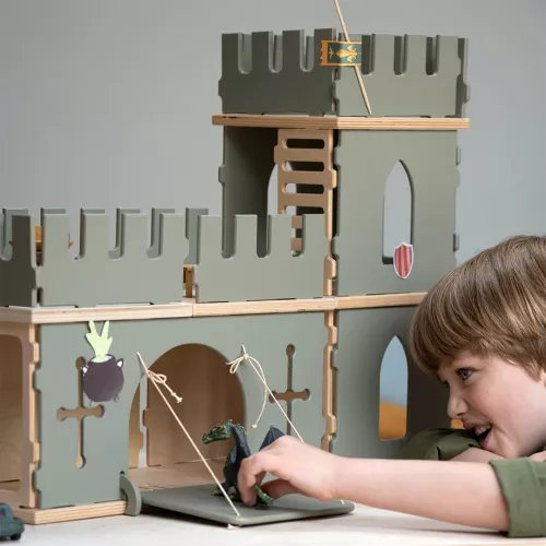 Maak van het basic poppenhuis een Middeleeuws kasteel met deze 17-delige set ‘Fabelab Build – Add-on Fortress’ van het Deense merk Fabelab. Deze kasteelbouwset is uitgevoerd in een mooie loodgrijze kleur en met karakteristieke kasteelramen, kantelen en ophaalbrug.