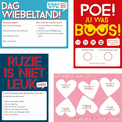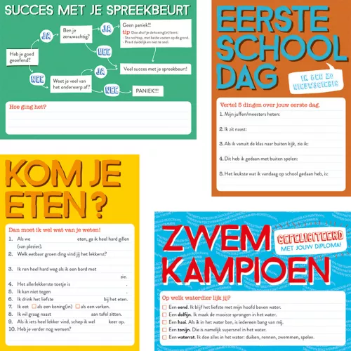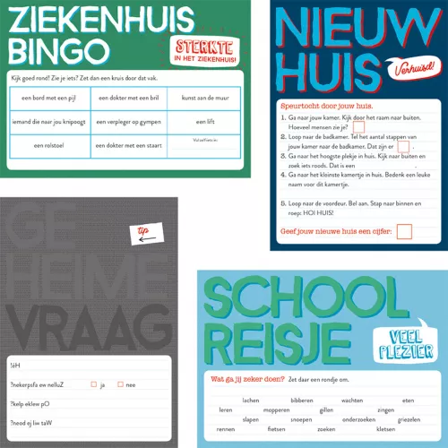 De set van 30 ansichtkaarten bestaat uit allerlei kinderkaarten voor alledaagse en bijzondere momenten. Op de voorkant staan vragen en opdrachtjes die de ontvanger uitnodigen om de kaart in te vullen en terug te sturen.
