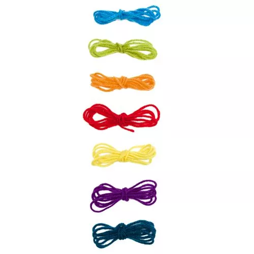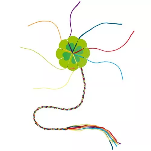 De knutselset bestaat uit een houten rijgkaart (klaver of bloem) en katoenen draden in zeven verschillende kleuren.