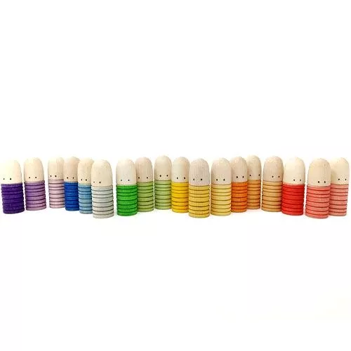Deze houten speelgoedpoppetjes van het Spaanse merk Grapat bieden kleine kinderen alle mogelijkheden om met verbeeldingskracht op te gaan in een eigen verhaal. Speelgoed met een open einde en overal inzetbaar. Het laat creativiteit de vrije loop gaan, stimuleert rekenen en onderscheid maken door de kleuren te ordenen.