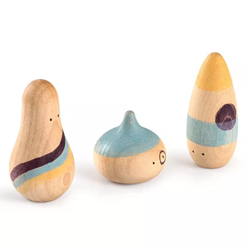 Drie grappige, abstract vormgegeven speelfiguren ‘Wow!’ uit de serie ‘Wild’ van het Spaanse merk Grapat die de fantasie prikkelen en uitnodigen tot het maken van verhaaltjes.