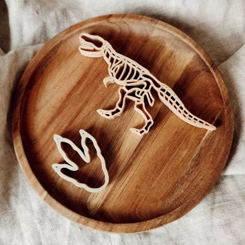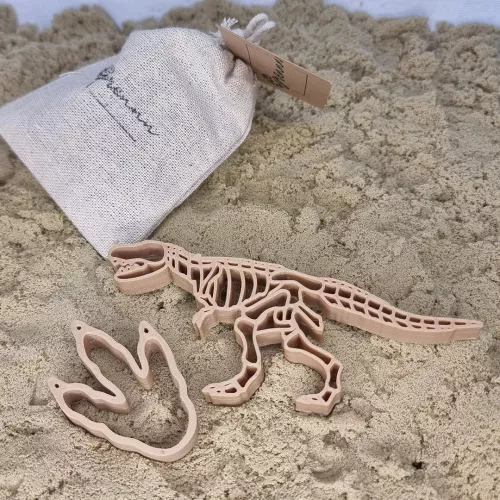 Twee stoere uitstekers in de vorm van een dino en een pootafdruk. De duurzame zandvormpjes van het Nederlandse merk Grennn maken een mooie afdruk in bijvoorbeeld zand of boetseerklei.