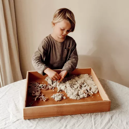 Gebruik de uitsteekvorm bijvoorbeeld in de speelbak met het magische, kinetische zand van Grennn. De zandvormpjes zijn verpakt in een linnen opbergzakje.
