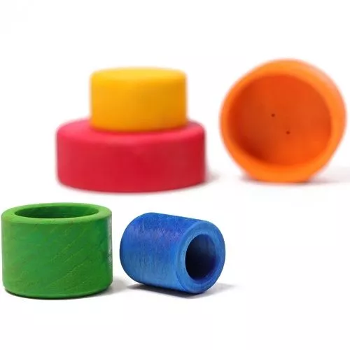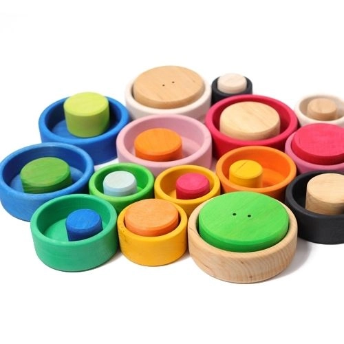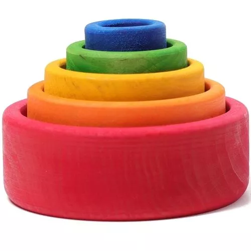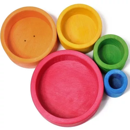 Met deze kleurige houten speelgoedkommenset van het Duitse merk Grimm’s kunnen kleine kinderen verschillende dingen doen. Als ze heel klein zijn, zijn het vooral de sprekende kleuren waar ze naar grijpen. Vervolgens wordt het de eerste stapeltoren. En dan ontdekken dat er dingetjes in kunnen en tenslotte blijkt dat de kommen allemaal in elkaar passen. Verrassing!