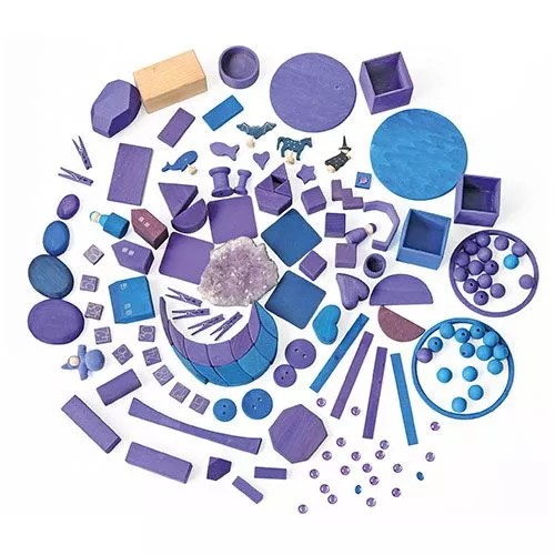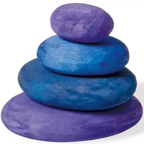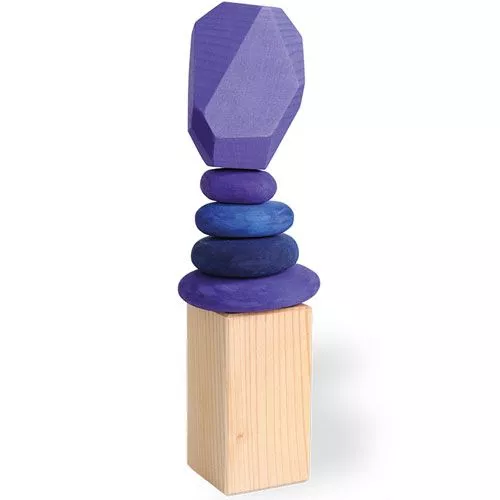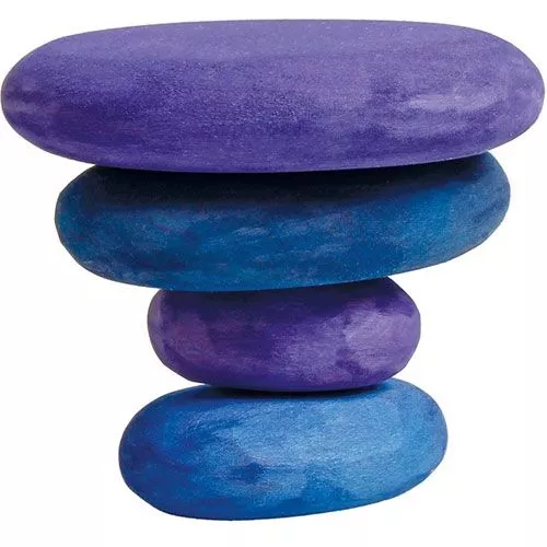 Houten ‘kiezelstenen’ van het Duitse merk Grimm’s. De vier dikke ovale schijven in verschillende paars- en blauwtinten kunnen gestapeld worden. Voor kleine peuters is het nog een verrassend lastig klusje om ze in balans te brengen. Zo worden ze op speelse wijze gestimuleerd om hun gevoel voor ruimte en evenwicht te ontwikkelen.