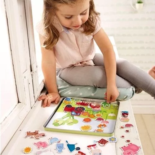 Deze speelgoedset bevat vier achtergronden en 122 magneten waarmee steeds weer andere verhalen verteld worden. Een afgemaakte kaart kan ook als schilderij of achtergronddecor in de kinderkamer dienen.Â
