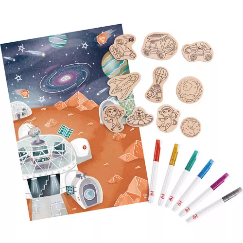 Ga op onderzoek uit op Mars met deze poster en houten magneetjes ‘Mars Life DIY magnets’ van het Duitse merk Hape.
