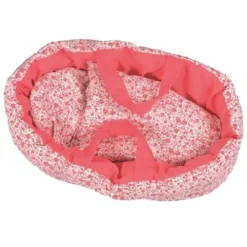 De houten speelgoedwagen is prachtig afgewerkt in warme oranje en grijze kleuren met een doorzichtige ruit en draaiende wielen.