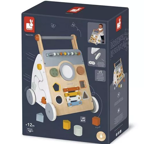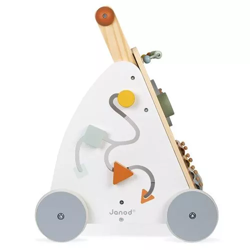 Een vrolijke multi-activiteitentrolley ‘Sweet Cocoon’ van het Franse merk Janod voor het oefenen van de eerste stapjes. Dit verrijdbare houten speelgoedwagentje heeft 9 ingebouwde speeltjes. Hiermee kan de kleine tijdens de ontdekkingstocht door de kamer zich ook nog eens te entertainen, als de beentjes moe worden.