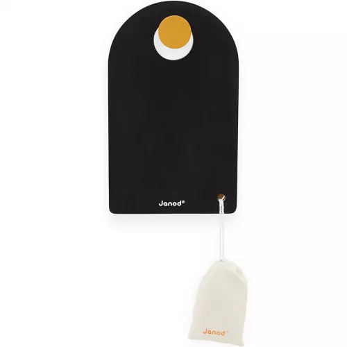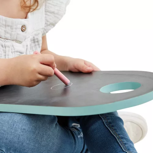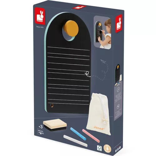Een handzaam, dubbelzijdig houten schoolbord van het Franse merk Janod om in verschillende plekken in het huis of onderweg te tekenen en schrijven.