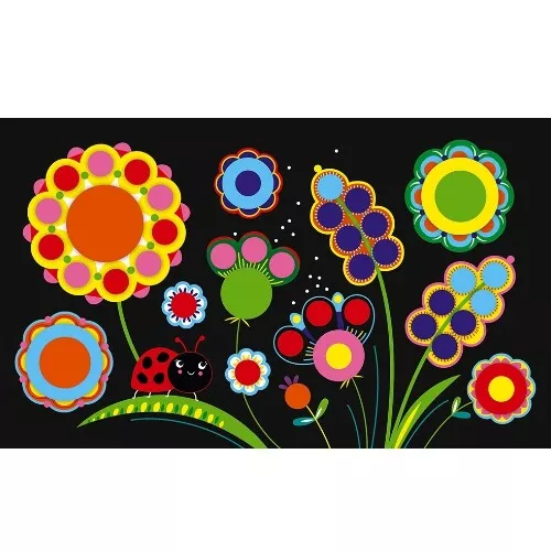 Kinderen gebruiken de ronde stickers om de witte vakken op de kaarten te vullen. Zo ontstaan kleurrijke prenten om op te hangen of cadeau te geven.