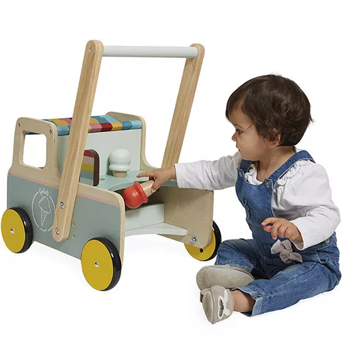 Kinderen gaan op ontdekking en oefenen zelfstandig de eerste stapjes met deze houten loopwagen van het Franse merk Janod. De stabiele ijscokar heeft een luifel, een opbergvak voor speelgoed en knuffels en wordt geleverd met vier heerlijke speelgoedijsjes voor onderweg.