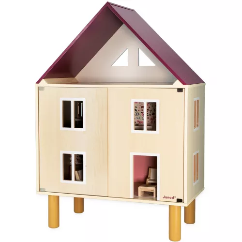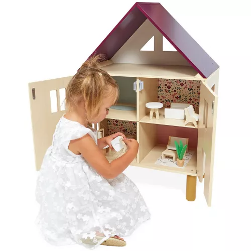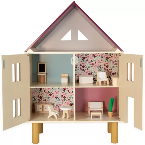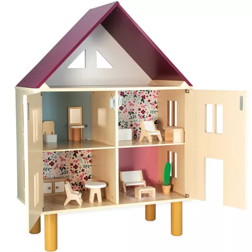 Het speelgoedpoppenhuis telt drie verdiepingen en heeft in totaal vijf kamers. De voorkant kan zowel open als dicht en aan de voor- en achterkant is het huis voorzien van raampjes. Het huis is heeft vrolijk geschilderde muren en is ingericht met 11 houten accessoires.