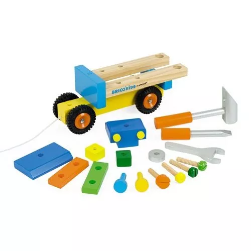 Met deze stoere houten trekfiguur ‘Camion Bricolo’ van het Franse merk Janod kunnen kleine jongetjes naar hartelust bouwen en knutselen met het speelgoedgereedschap.