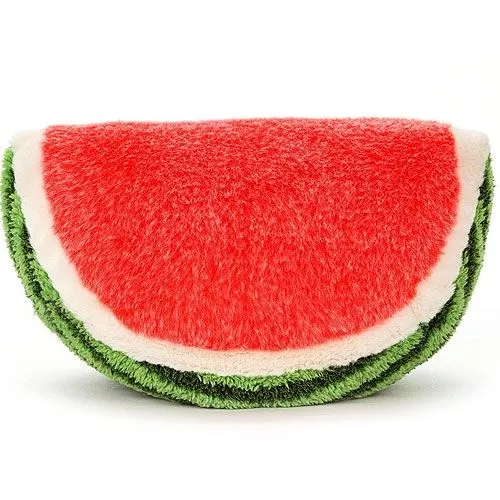 ‘Amuseable Watermelon’ van het Engelse merk Jellycat is een puik partje watermeloen om van te watertanden. Heerlijk donkerroze vruchtvlees met daarin twee vriendelijke kraalogen en een geborduurde glimlach. De pluche watermeloen heeft bruine corduroy beentjes en een groene, gestreepte jas aan. Hoewel zonder enige pit, geeft deze meloen een boel positieve energie.