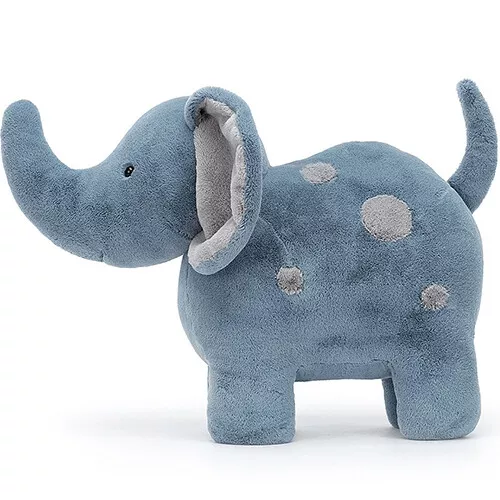 Olifant ‘Big Spottie Elephant’ uit de Big & Bold serie van het Engelse merk Jellycat heeft alles in zich om een lievelingsknuffel te worden voor de allerkleinsten: een fluweelzachte vacht, vriendelijk koppie en kraaloogjes. Deze stevige knuffelolifant heeft grijze sproeten op zijn lichaam en een parmantige lange slurf.
