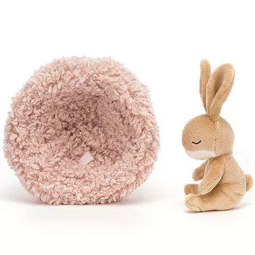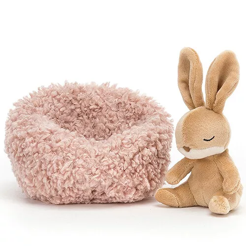 Dit piepkleine, soezende konijntje is een knuffeltje voor de allerkleinsten. ‘Hibernating Bunny’ uit de Little Legs serie van het Engelse merk Jellycat is met haar wollige teddy mandje klaar voor een diepe winterslaap, maar voor een knuffel wil zij af en toe wel uit haar nestje komen.