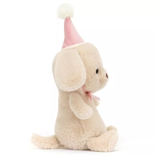 Knuffelhond ‘Jollipop Puppy’ uit de Dressed to Impress serie van het Engelse merk Jellycat is met zijn feestmutsje met pompon klaar voor een feestje.
