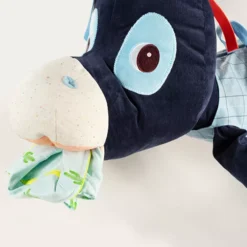 De knuffeldino is verzwaard met korreltjes, waardoor hij goed blijft staan en is geschikt voor kinderen vanaf de geboorte.