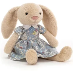 Het knuffelkonijn draagt een pastelblauwe jurk met bloemen en heeft lange slappe oren.
