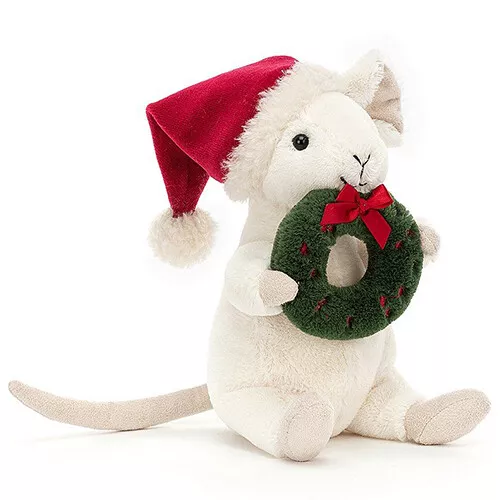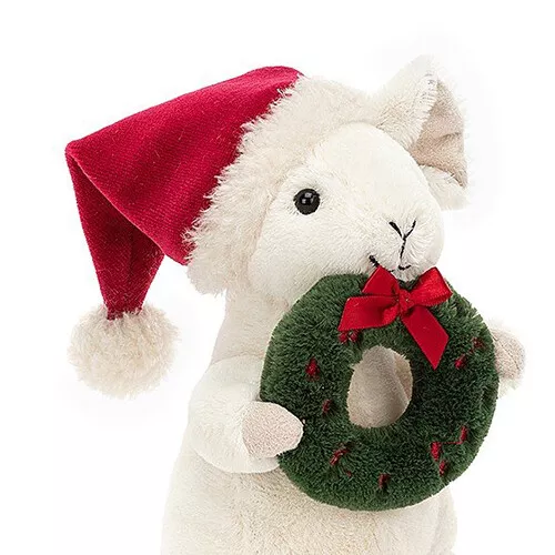 ‘Merry Mouse Wreath’ van het Engelse merk Jellycat is een goedaardig knuffelmaatje, dat graag wordt vertroeteld. Met zachte, crème-witte vacht, zwarte kraaloogjes, suède pootjes en vrolijke kerstmuts is deze knuffelmuis onweerstaanbaar.