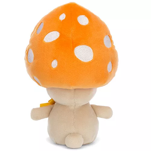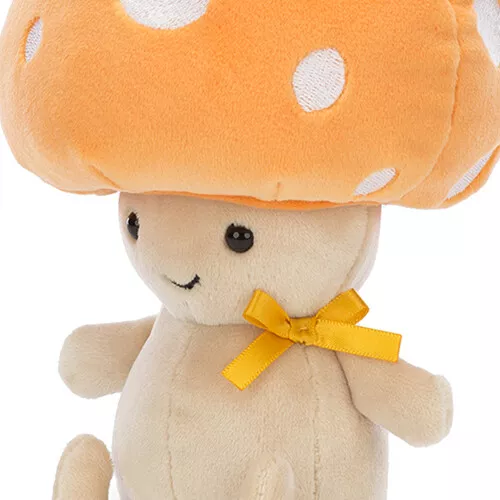 Om de nek heeft de paddenstoelknuffel een oranje satijnen strikje. Een blije paddenstoelenknuffel met kraaloogjes, vriendelijke glimlach om te knuffelen en om altijd bij de hand te hebben.
