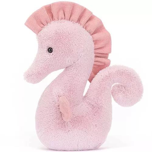 ‘Sienna Seahorse’ van het Engelse merk Jellycat is een sierlijk zeepaardknuffeltje met een fluweelzachte, roze vacht, krullende staart en vinnetjes van corduroy. Met haar kraalogen kijkt zij haar vriendinnetje zijdelings aan met de vraag om een knuffel.