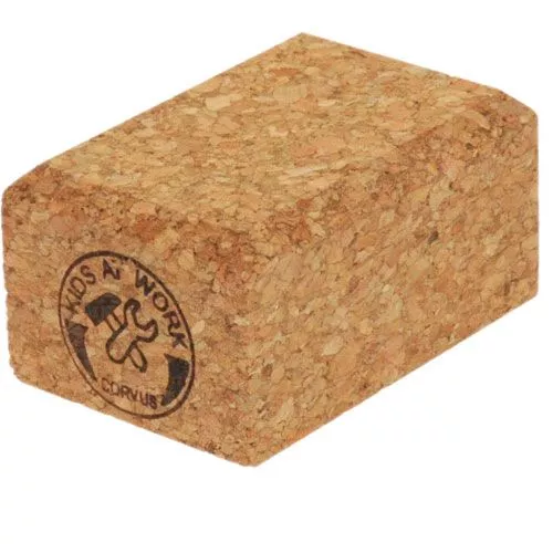 Vijf schuurblokken vam kurk met grof en fijn schuurpapier uit de serie Kids-at-Work van het Duitse speelgoedmerk Corvus.