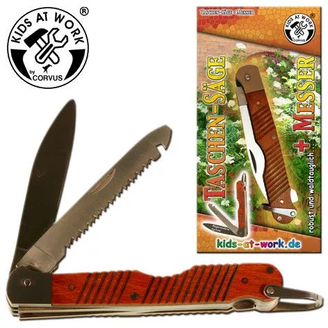 Handig, een zakmes met kleine zaag uit de serie Kids-at-Work van het Duitse speelgoedmerk Corvus om op zak te hebben bij al je creatieve projecten. Het mes en de zaag hebben afgeronde punten.Â