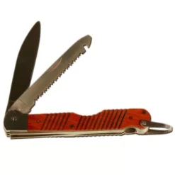 Het zakmes heeft een houten handvat met metalen ring en een ontgrendelingsknop waardoor het mesje en de kleine zaag veilig ingeklapt blijven als er niet mee gewerkt wordt.Â