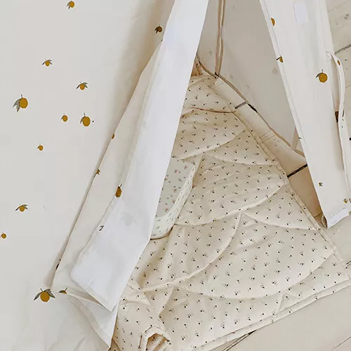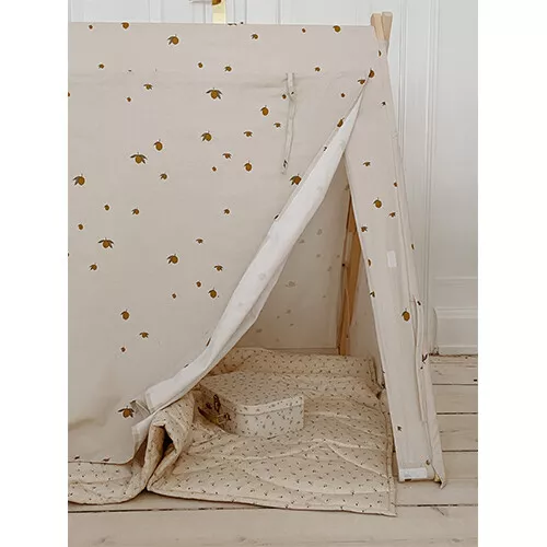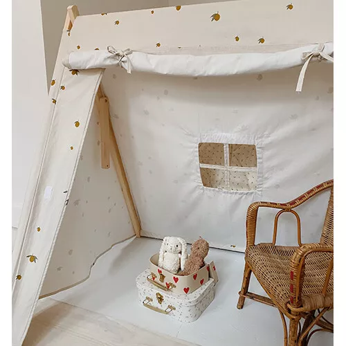 Deze speeltent ‘Cherry Blush’ van het Deense merk Konges Sløjd biedt kinderen een heerlijk knus plekje om in te schuilen, spelen, lezen en ontspannen. Het speelhuisje bestaat uit een houten frame en een katoenen tentdoek met een dessin van citroentjes.