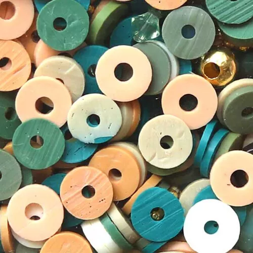 De Heishi / Heishe kralen zijn zeer dunne en platte ringetjes gemaakt van polymeerklei. Het polymeerklei van deze kralen zijn type Fimo, dus speciaal voor kinderen.
