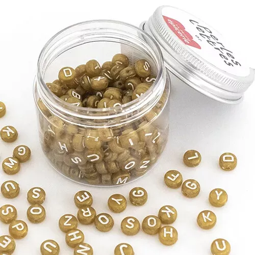 Een potje met 200 alfabetkralen in het goud van het Franse merk La Petite Épicerie. Rijg namen, opvallende woordjes of bijzondere spreuken in een ketting of armband.