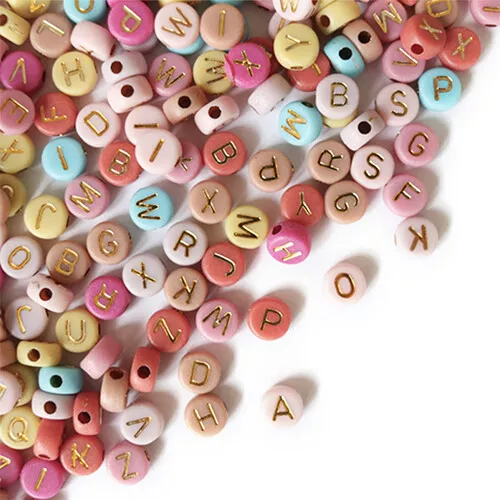 Het potje heeft een inhoud van 200 gekleurde kralen met gouden letters om kindersieraden en accessoires te personaliseren.