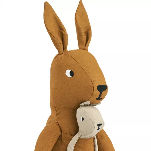 Deze kleine kangoeroeknuffel met haar jong ‘Myra Teddy S – Kangaroo/Golden Caramel’ van het Deense merk Liewood is een heerlijk knuffeltje voor de allerkleinsten. De kangoeroeknuffel heeft een lieflijk geborduurde snoet en een zoet kleintje in de buidel.