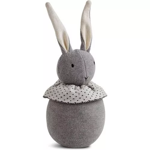 Dit lichgrijze knuffelkonijn ‘Valdemar knit doll – Rabbit grey melange’ van het Deense merk Liewood heeft een sierlijke wit-zwarte kraag en geborduurde snuit. Door het simpele silhouet met zijn kenmerkende oren en pluisstaart, spreekt dit konijn tot de verbeelding van de kleine.