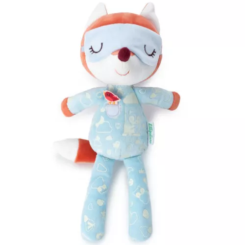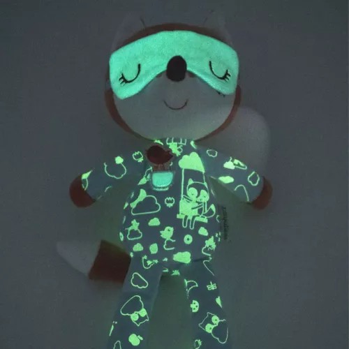 Deze vossenknuffel is voorzien van een glow-in-the-dark slaapmasker en het slaappakje is versierd met glow-in-the-dark illustraties.
