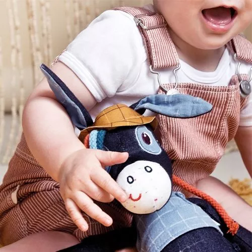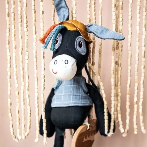 Deze katoenen knuffelezel ‘Ignace’ van het Belgische merk Lilliputiens brengt kindjes naar dromenland op de tonen van ‘Fly me to the moon’. Door aan zijn saxofoon muziekkoord te trekken maakt de speelgoedknuffel muziek.