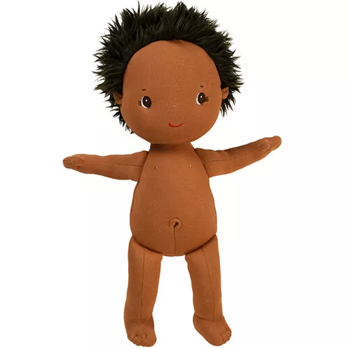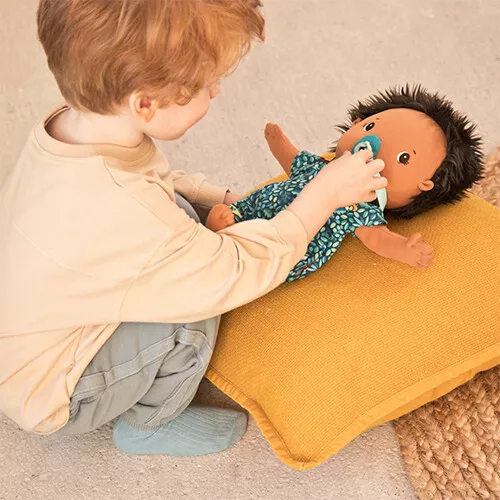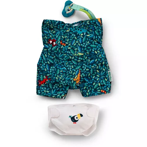 De speelgoedset bestaat uit de knuffelpop, een pakje met een dessin van bladeren, een luier en een fopspeen. De poppenkleren kunnen gemakkelijk aan- en uitgetrokken worden.